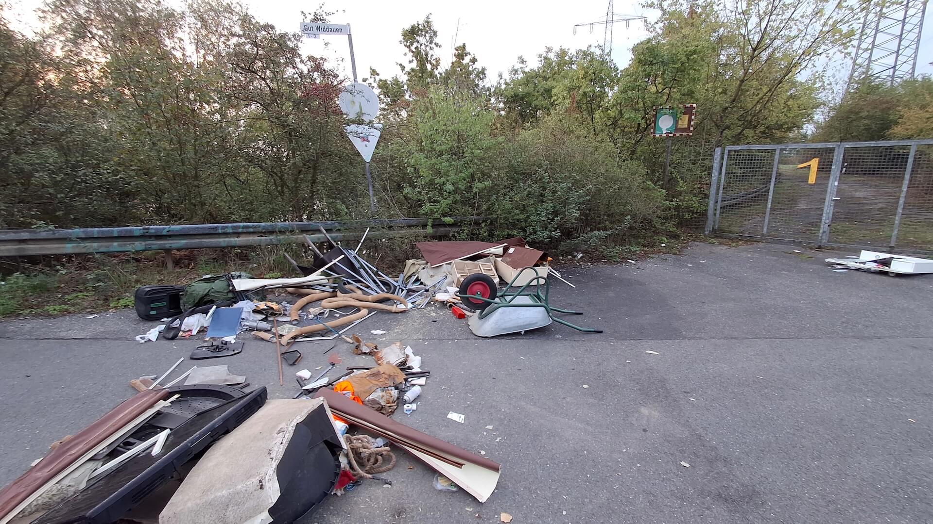 In Widdauen wurden neben einer Schubkarre, auch Rohre, Kisten und anderer Unrat unachtsam auf der Straße und am Wegesrand großflächig entsorgt.