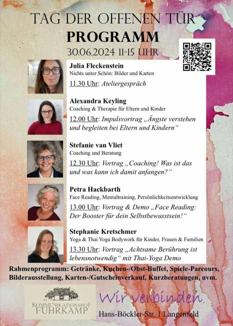 Am 30. Juni 2024 erwecken fünf bemerkenswerte Frauen den Kommunikationshof Fuhrkamp in Langenfeld zu neuem Leben und laden Sie herzlich ein, in ihre Welt der Kreativität, Empowerment und Entspannung einzutauchen.