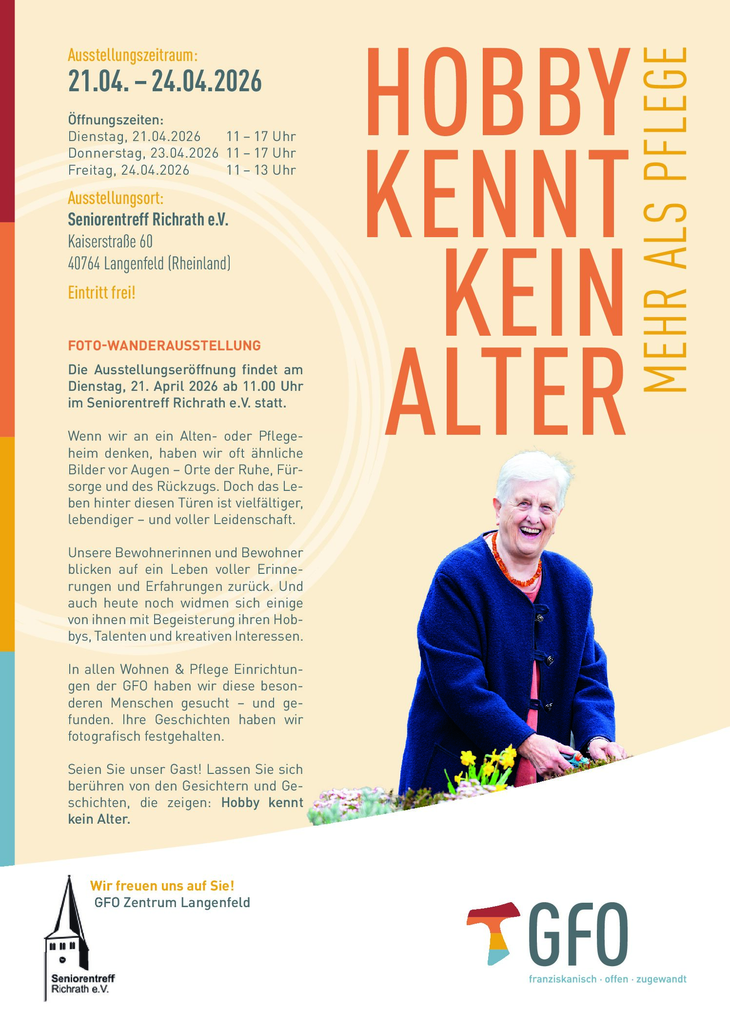 Die feierliche Eröffnung findet am Dienstag, den 21.April um 11:00 Uhr statt. Veranstalter sind das GFO Zentrum Langenfeld in Kooperation mit dem Seniorentreff Richrath e.V.. Alle Interessierten sind herzlich eingeladen, sich von den Fotografien und Geschichten berühren und inspirieren zu lassen.