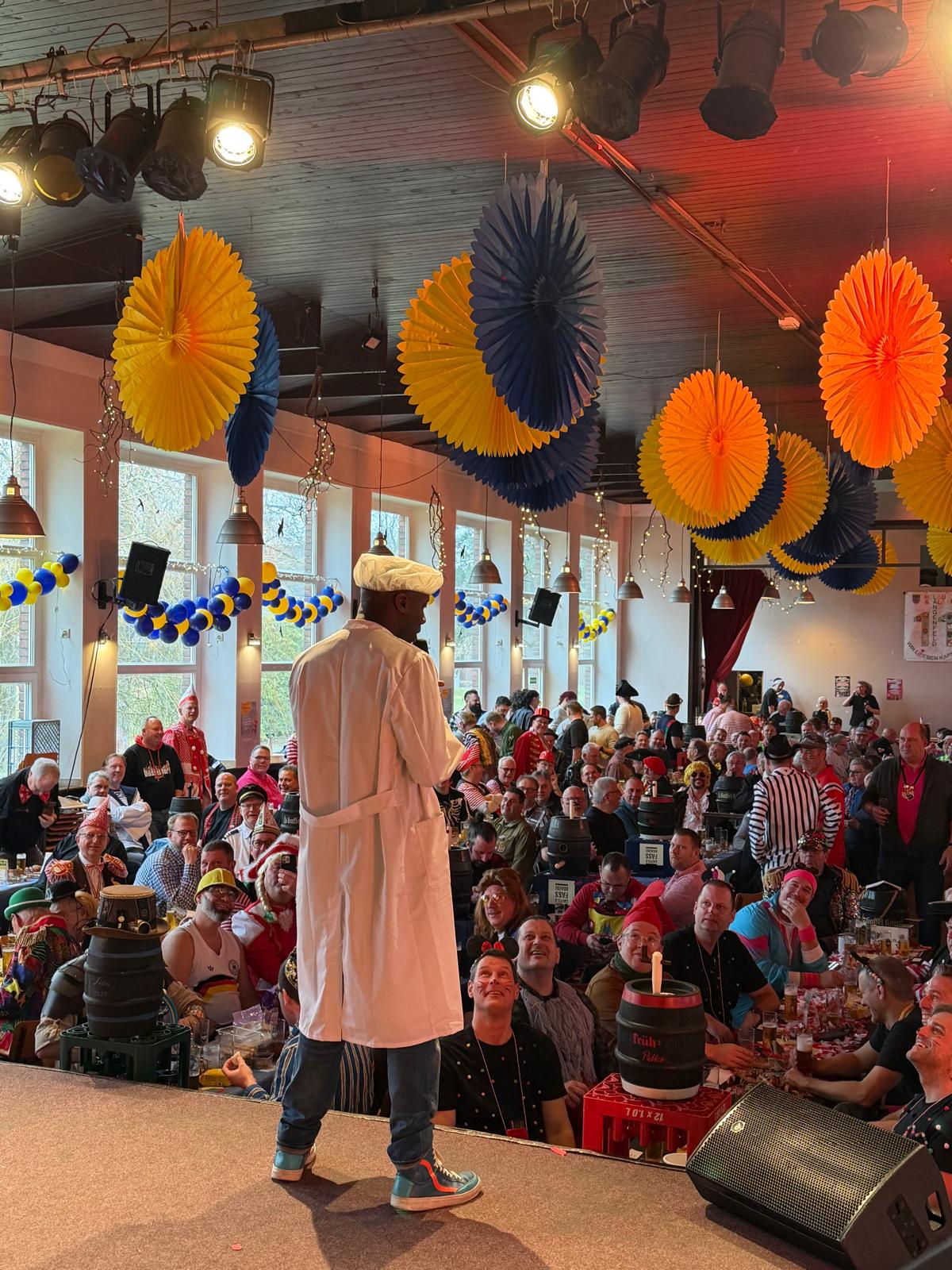 Eindrucksvolle tänzerische Akzente setzte das Rheinische Tanzcorps „Echte Fründe“, das seinen ersten Auftritt der Session im eigenen Trainingsdomizil sichtlich genoss und vom Publikum mit großem Applaus belohnt wurde. Ein weiterer Höhepunkt folgte mit Dave Davis alias „Motombo“, der mit seinem unverwechselbaren Humor für Begeisterung sorgte. Auch das Tanzcorps Rheinmatrosen überzeugte mit einer energiegeladenen Darbietung.