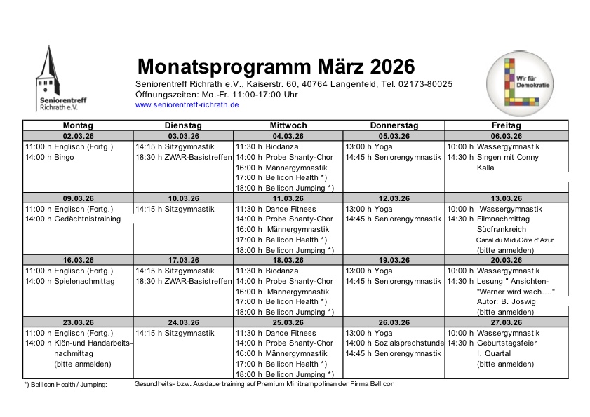 Das Programm des Seniorentreffs Richrath e.V. für den März 2026 bietet eine abwechslungsreiche Mischung aus Sport, Kultur und geselligem Beisammensein. Das Angebot ist klar strukturiert und findet werktags in der Kaiserstraße 60 in Langenfeld statt.
