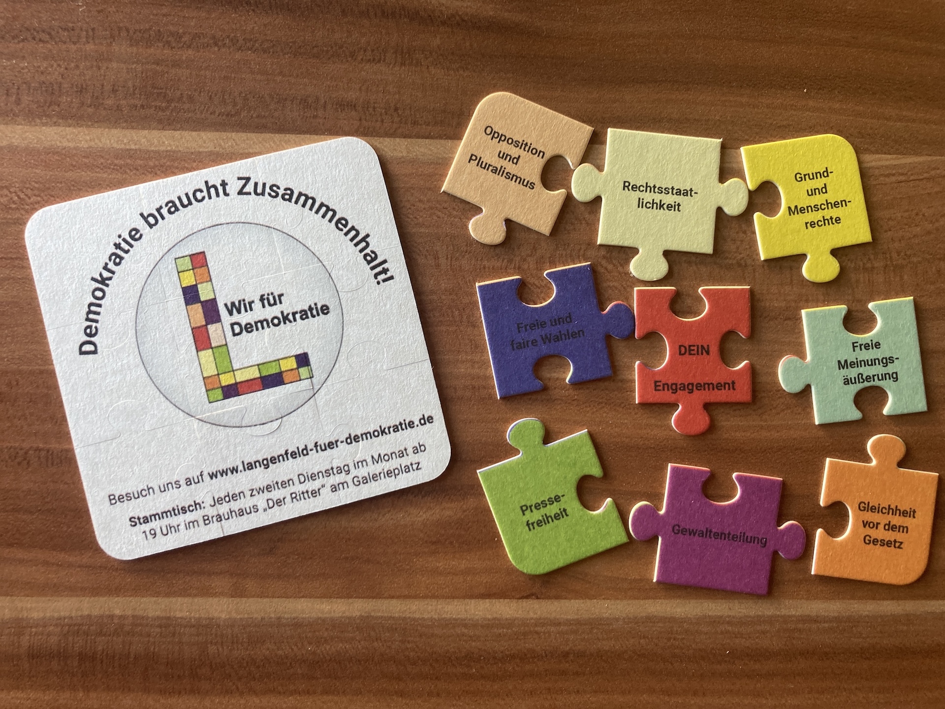 Mit einem neuen Bierdeckel macht das Bündnis zudem aufmerksam auf zentrale Bausteine der Demokratie – von Pressefreiheit über Rechtsstaatlichkeit bis hin zu Grund- und Menschenrechten. Das Motiv zeigt auf spielerische Weise: Demokratie braucht Zusammenhalt!
