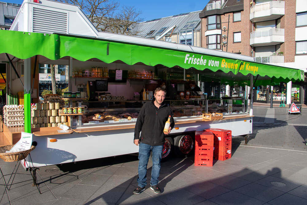 Im 2. Teil unserer Blogserie stellen wir euch den Markstand des „Bauernhof Kempe“ vor: Der Bauernhof Kempe aus dem Bergischen Land ist bereits seit sieben Jahren auf dem Langenfelder Wochenmarkt vertreten. Damals haben sie gerade ein zweites Fahrzeug erneuert und einen guten Markt in Langenfeld besucht. Dieser hat wohl Eindruck hinterlassen, denn seitdem ist der Bauernhof Kempe nicht mehr aus Langenfeld wegzudenken. Hier bekommen Kunden unter anderem frische Eier, Wildgulasch, Wurst, Aufschnitt, Grillspezialitäten und Damwild-Fleisch aus dem eigenen Gehege. Die Auswahl an To-Go-Food ist ebenfalls groß, es gibt zum Beispiel Schnitzelbrötchen, Spießbraten oder Grillhähnchen. Neben eigenem Geflügel- & Wildfond, der nach eigener Aussage stark eingekocht und damit sehr geschmackvoll sei, wird das Angebot mit Eierlikör und Wildfrikadellen abgerundet. Letztere seien wohl die Spezialität des Bauernhofs – zumindest wenn es nach einigen Kunden geht. Wildfrikadellen gibt es nämlich sonst fast nirgendwo zu kaufen.